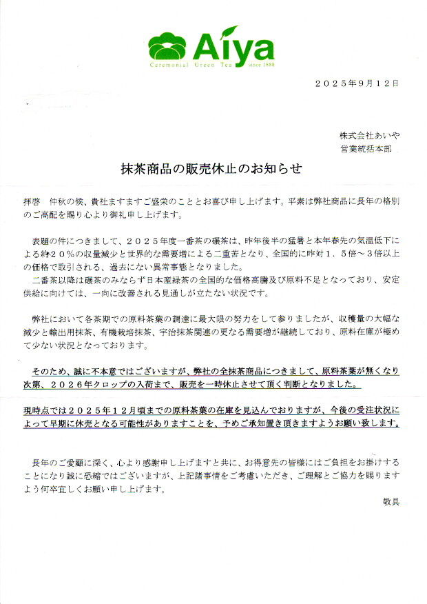 株式会社 あいや(西条園) 在庫のみ販売のお知らせ 2025年10月06日 おさだ苑では、現在在庫みのを販売しております。今後につきましては、変更等ございましたら、ご報告いたします。 よろしくお願いいたします。 次» 新着情報
